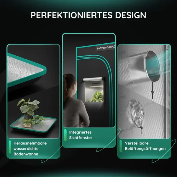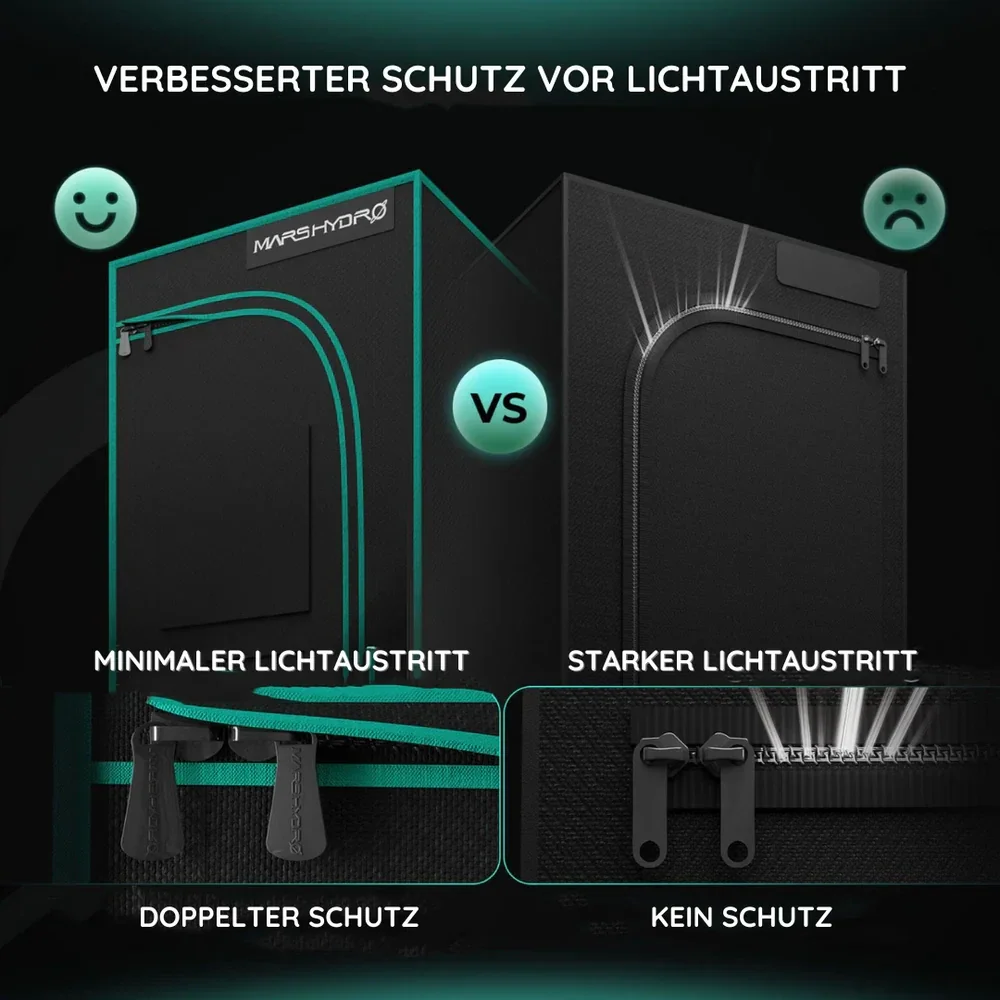 Zubehör/Lieferumfang: Im Lieferumfang enthalten: Growzelt, Hightech LED Beleuchtung, Zeitschaltuhr, Thermometer, Lampenaufhängung, Belüftungsanlage inkl. Schlauch und Klemmen, Aktivkohlefilter, Gitternetz, Seilaufhänger